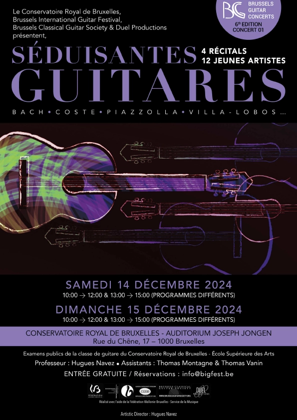 Organisatie : Brussels Classical Guitar Society & Duel Productions Artistieke leiding : Hugues Navez Contact :info@bigfest.be Partners : Conservatoire Royal de Bruxelles-École Supérieure des Arts - Brussels International Guitar Festival & Competitions - Classical Guitar Society of Belgium - Savarez
