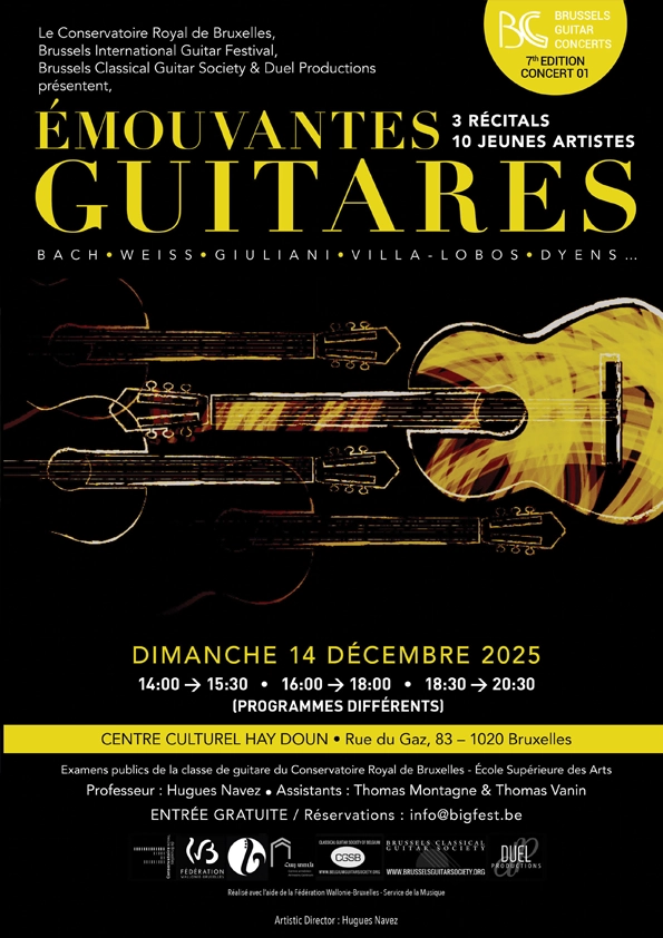 Uitzonderlijk zullen de publieke winterexamens van de gitaarklas van Conservatoire Royal de Bruxelles-École Supérieure des Arts plaats vinden in het Théâtre de la Clarencière (achter Flagey). Werken van Bach, Dowland, Giuliani, Villa-Lobos, Duplessy, Dyens, Jirmal...